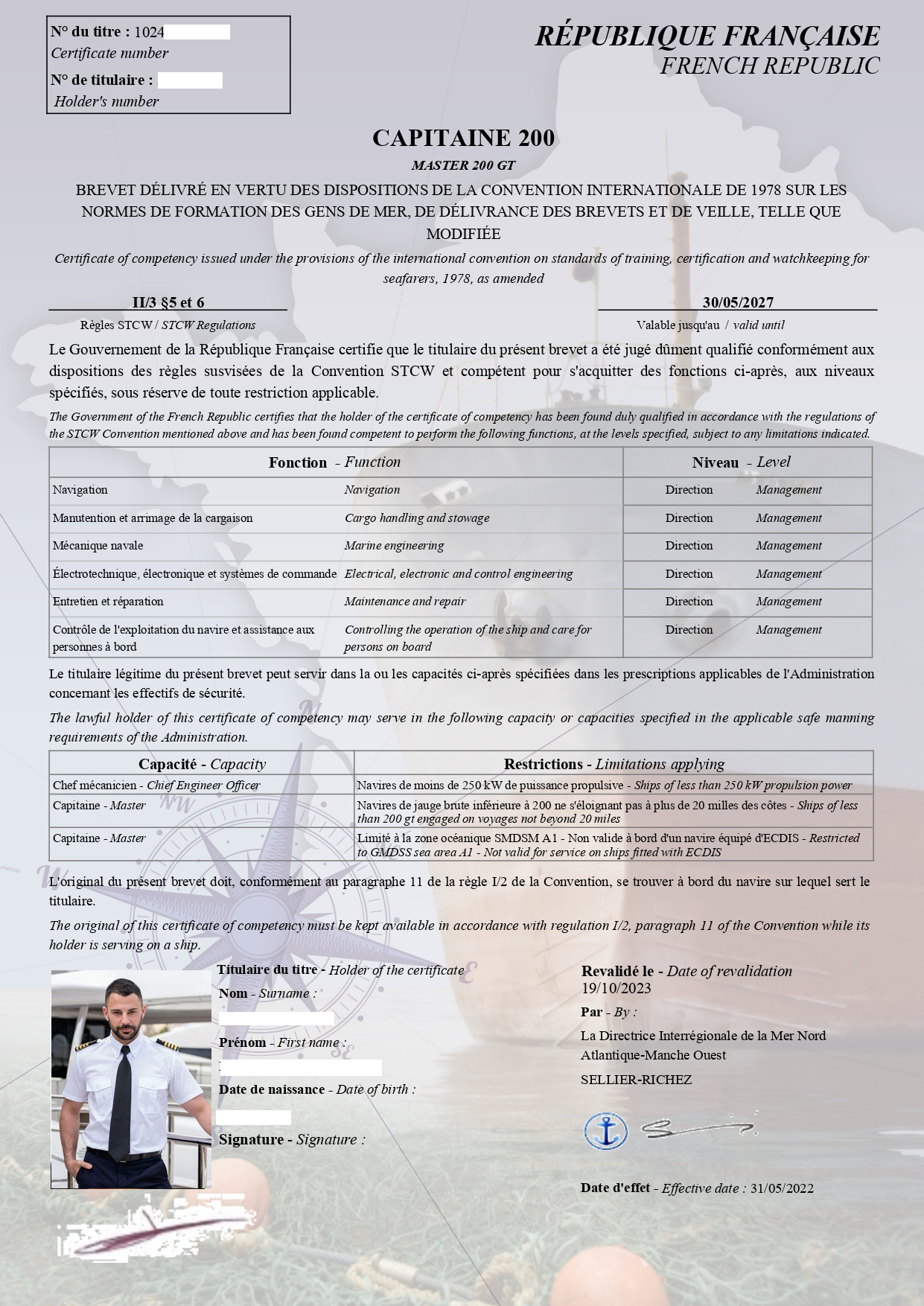 Dans l’application de la réglementation maritime STCW, tous nos capitaines disposent d’un brevet maritime professionnel à jour.